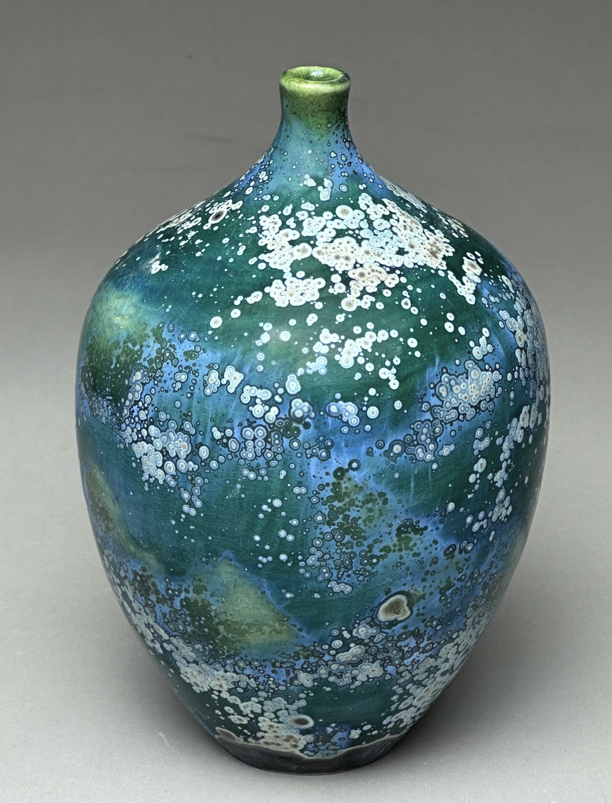 I have fun making porcelain and white stoneware crystalline glazed pieces.